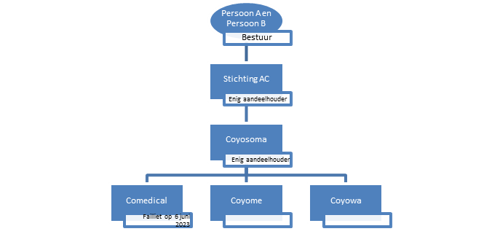 3. Comedical B.V. (hierna: ‘Comedical’) is op 6 juni 2023 failliet verklaard. Comedical kent twee uiteindelijke natuurlijke personen als bestuurders (‘Persoon A’ en ‘Persoon B’). De enige aandeelhouder van Comedical is Coyosamo B.V. (‘Coyosamo ), die op haar beurt ook enig aandeelhouder is van Coyome B.V. (‘Coyome’) en Coyowa B.V. (‘Coyowa’). De Stichting Administratiekantoor Coyosoma (‘Stichting AC’) is enig aandeelhouder van Coyosoma. Persoon A en Persoon B zijn tevens bestuurders van Stichting AC. Visueel is de vennootschappelijke structuur als volgt weergegeven: